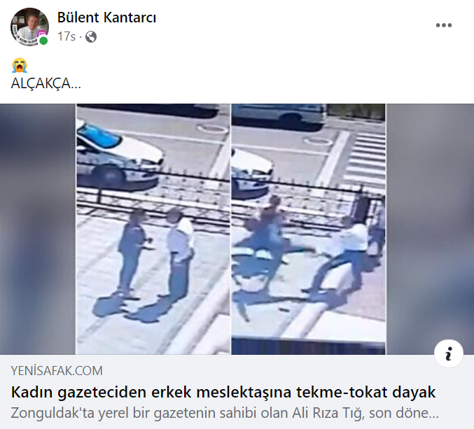 Çaycuma Belediye Başkanı Bülent Kantarcı, Pusula Gazetesi İmtiyaz Sahibi Ali Rıza Tığ’ın, Tempo Gazetesi Sahibi Alev Uzunbaş’tan tekme tokat dayak yediği görüntüleri kendi sosyal medya hesabından paylaşırken, paylaşımına “Alçakça” notu düştü.