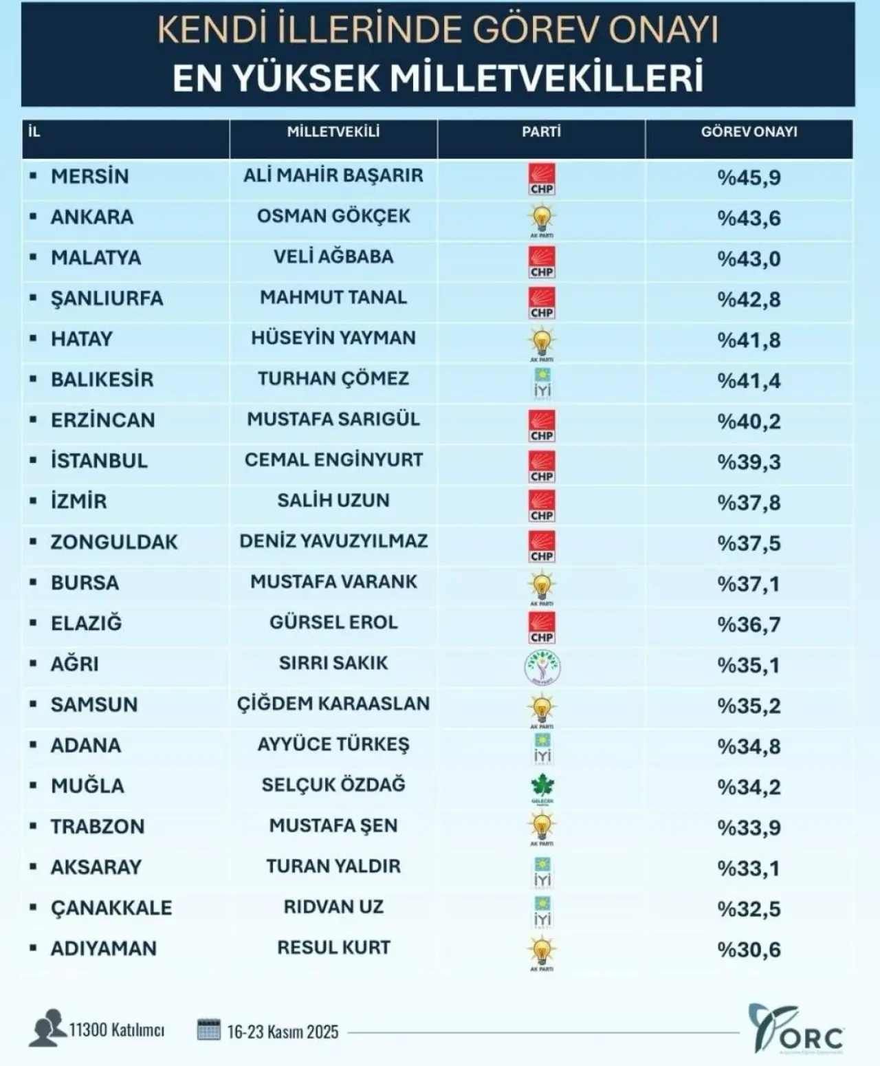 Araştırma sonuçlarına göre Zonguldak’ta CHP Genel Başkan Yardımcısı ve Zonguldak Milletvekili Deniz Yavuzyılmaz, yüzde 37,5 görev onayıyla kendi ilinde en yüksek destek alan milletvekili oldu.