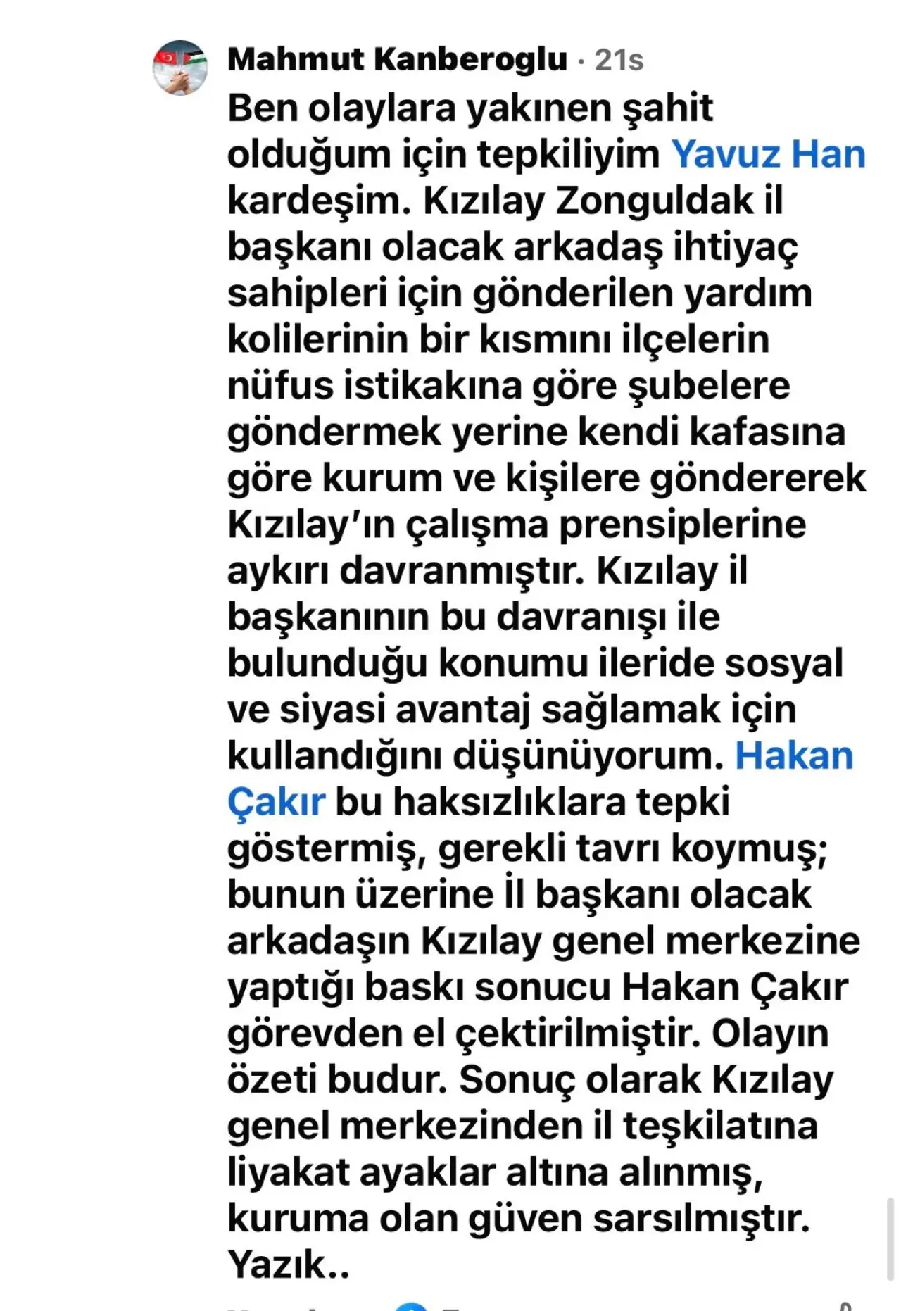 Öte yandan Hakan Çakır’ın görevden alınmasına tepki gösteren vatandaşlardan biri olan Mahmut Kanberoğlu, sosyal medya üzerinden yaptığı açıklamada Zonguldak Kızılay İl Başkanı Kürşat Yağız hakkında dikkat çeken iddialarda bulundu.