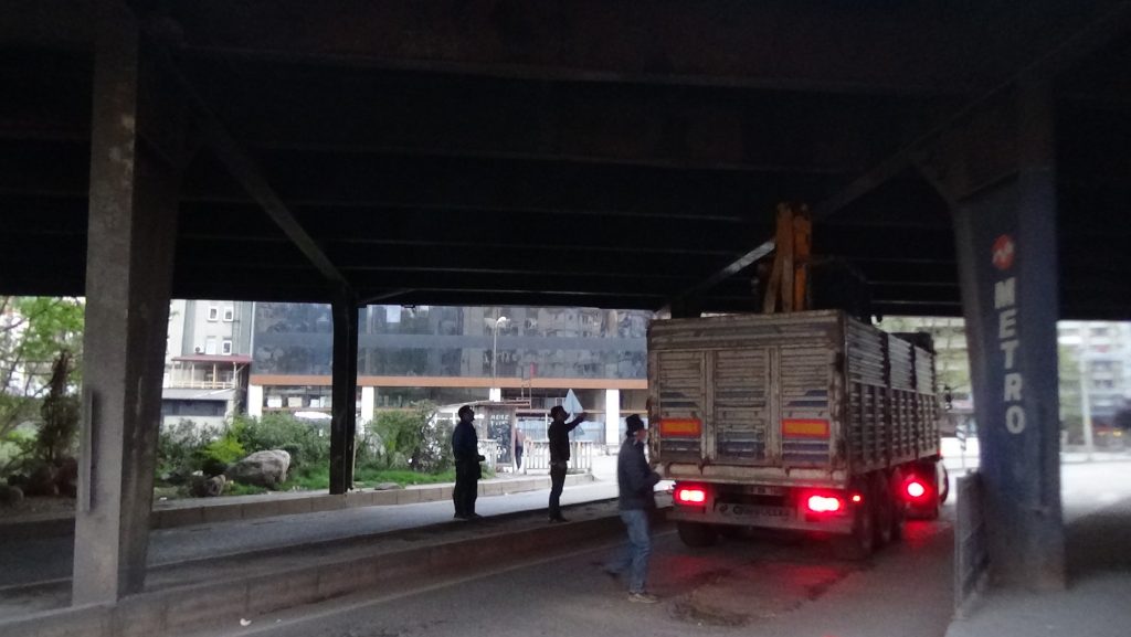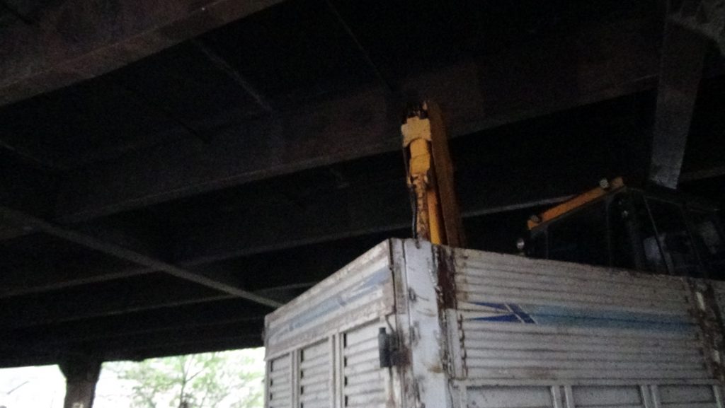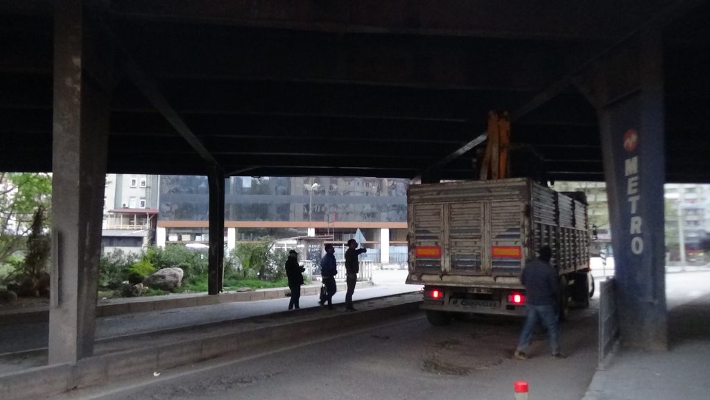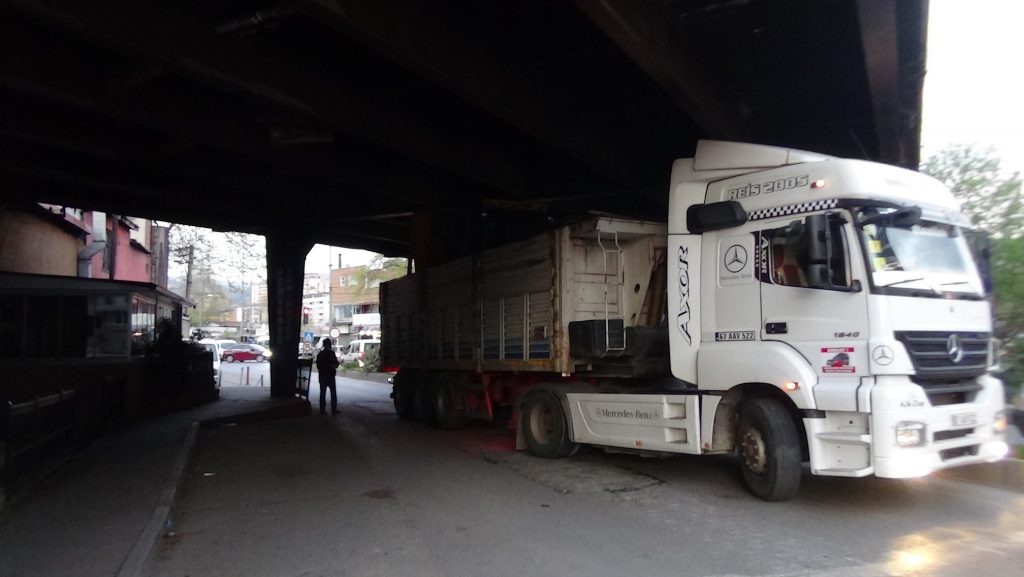 Zonguldak Merkez Bülent Ecevit Caddesi üzerinde seyir halinde olan iş makinesi taşıyan bir tır yüksekliği hesaplayamayınca fevkani köprüsü altında sıkıştı.