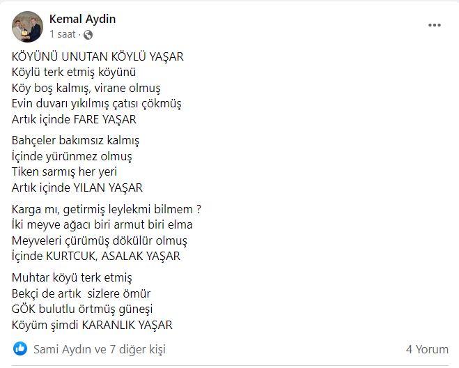 Kemal Aydın yazmış olduğu yazıların içerisindeki şifrelerle Yaşar Gök’ü ima ettiği belirtilirken, yazmış olduğu bir şiiri noktasına virgülüne dokunmadan paylaşıyoruz.