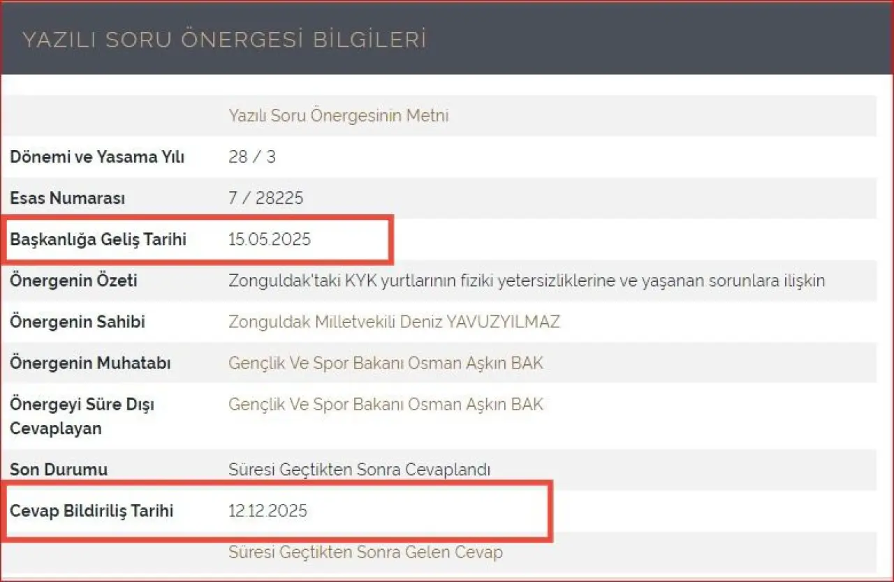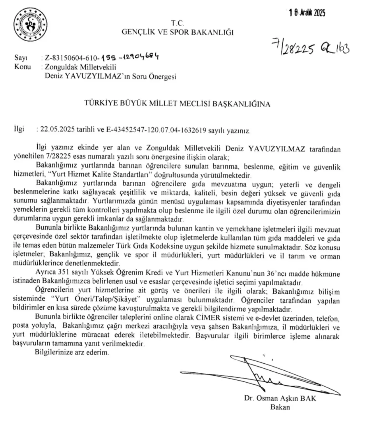 Ancak Bakan Osman Aşkın Bak tarafından aylar sonra verilen yanıtında, Zonguldak’ta Üniversite öğrencilerin yaşadığı barınma sorunlarının nedenini açıklamak yerine, sorumluluğu örtmeye yönelik genel ifadeler dikkat çekti.