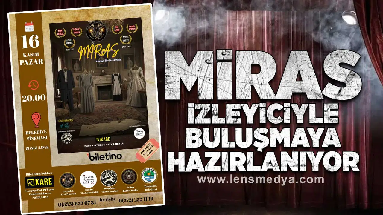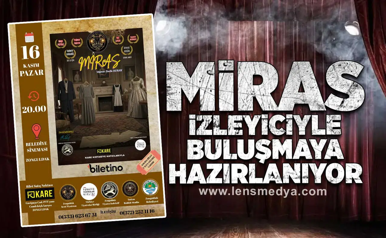 Yaklaşık 90 dakika sürecek olan “Miras”, aile yadigarı bir yüzüğün kime kaldığı üzerine gelişen olayları ve dört kadının bu miras etrafında yaşadığı komik çekişmeleri konu alıyor. Oyunda Neşe Poyraz, Yağmur Kapucu, Nur Aydın ve Yasemin Büyükkepe rol alırken; sahne amirliğini Ahmet Aygün, ses ve ışık tasarımını ise Ayberk Karagöz üstleniyor.