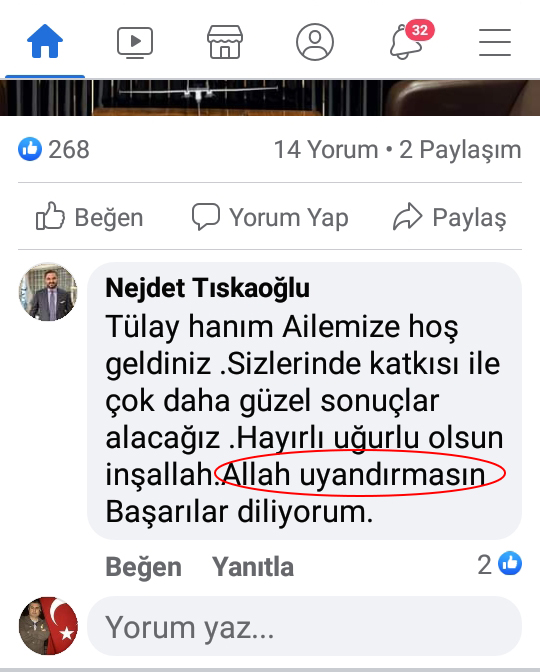 Tıskaoğlu bilerek mi yazdı yoksa harf hatası mı yaptı bilinmez ama Tülay Sayılı’ya yazmış olduğu ”Allah uyandırmasın” yorumu okuyanların gözünden kaçmadı!