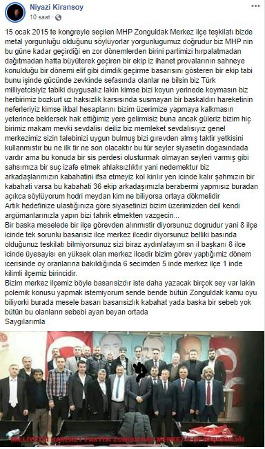 15 Ocak 2015'te kongreyle seçilen MHP Zonguldak Merkez ilçe teşkilatı bizde metal yorgunluğu olduğunu söylüyor. Yorgunluğumuz doğrudur. Biz MHP’nin bu güne kadar geçirdiği en zor dönemlerden birini partimizi hırpalatmadan dağıtmadan hatta büyüterek geçiren bir ekibiz. İhanet provalarının sahneye konulduğu bir dönemi elif gibi dimdik geçirme başarısını gösteren bir ekip. Tabi bunu işinde, gücünde, zevkinde, sefasında olanlar ne bilsin? Biz Türk milliyetçisiyiz tabii duygusalız lakin kimse bizi koyun yerine de koymasın. Biz her birimiz Bozkurt'uz haksızlık karsısında susmayan bir başkaldırı hareketinin neferleriyiz.