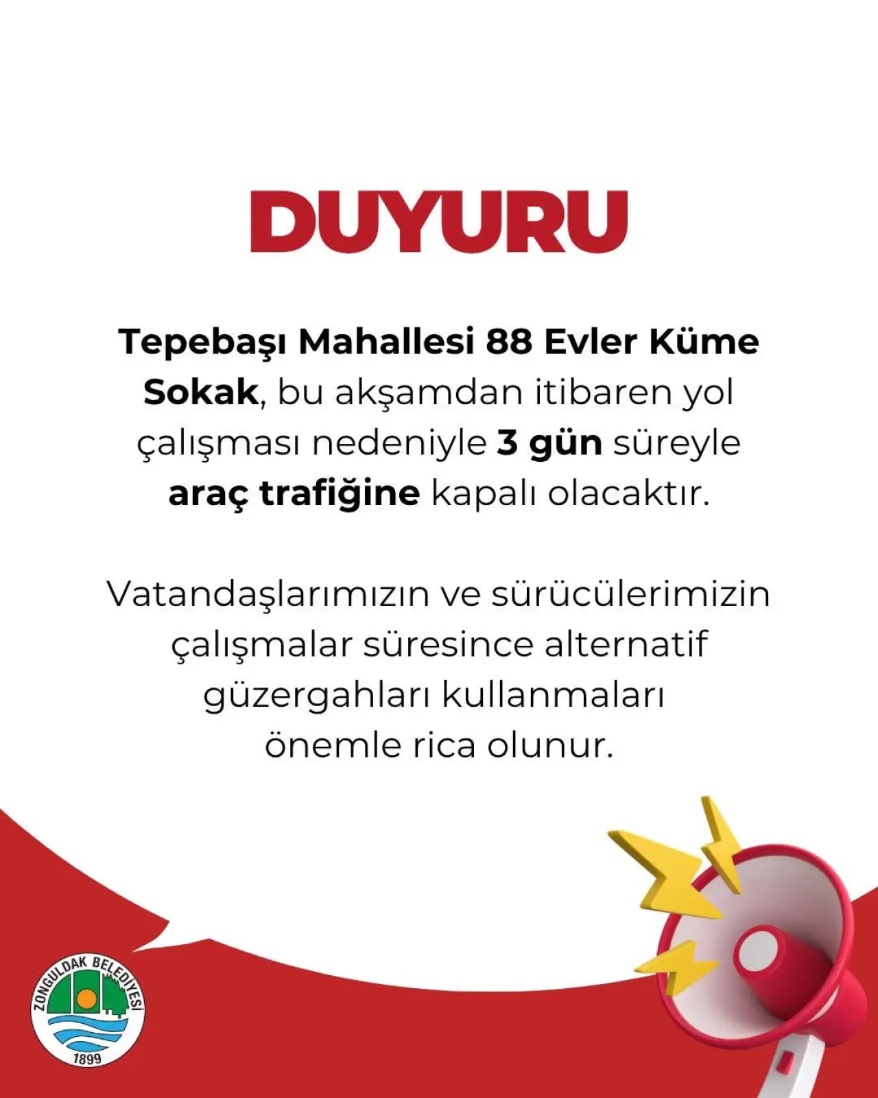 Zonguldak Belediyesi tarafından yapılan açıklamada, çalışmaların bu akşam itibarıyla başlayacağı belirtilerek, sürücülerin ve vatandaşların alternatif güzergâhları kullanmaları istendi.