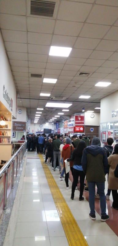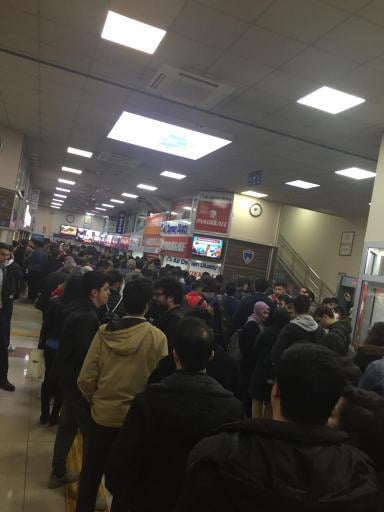 Tatil açıklamasının yeni yapılmış olmasına rağmen öğrenciler terminal içerisinde bilet alabilmek için sıra bekliyor.