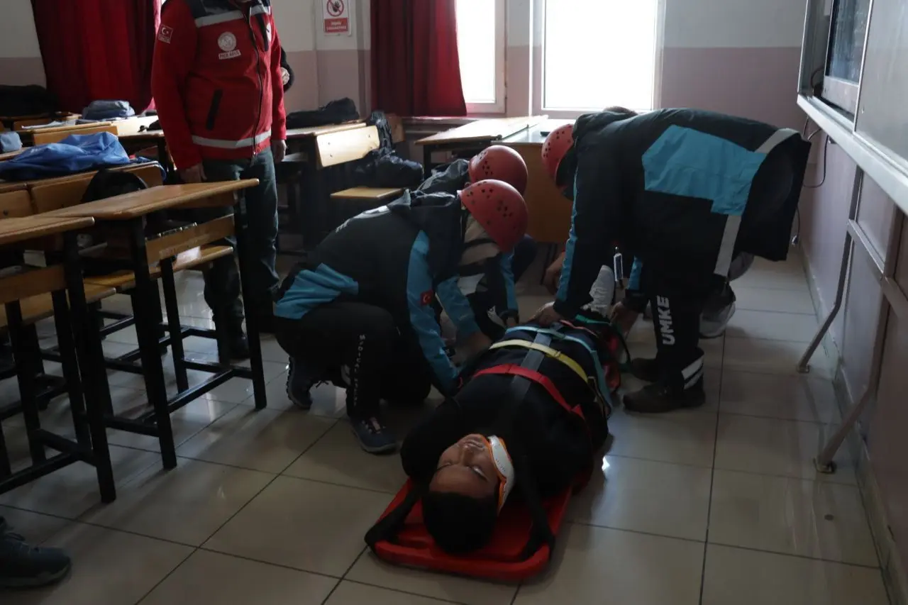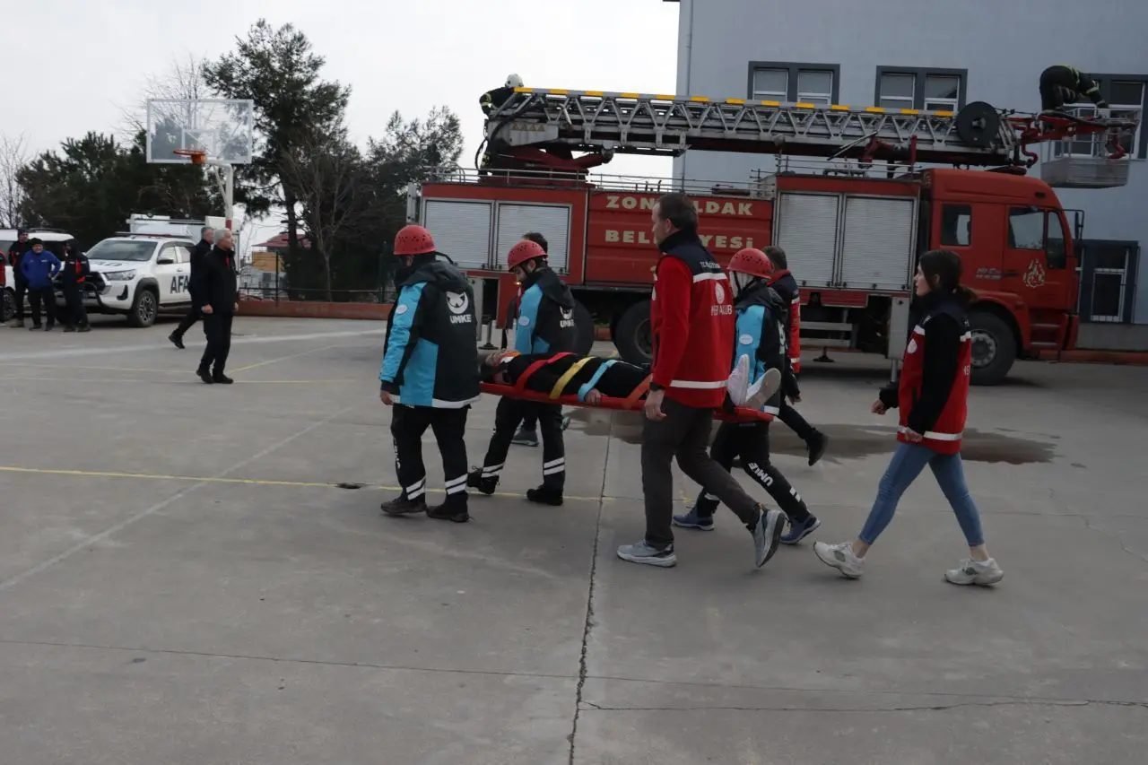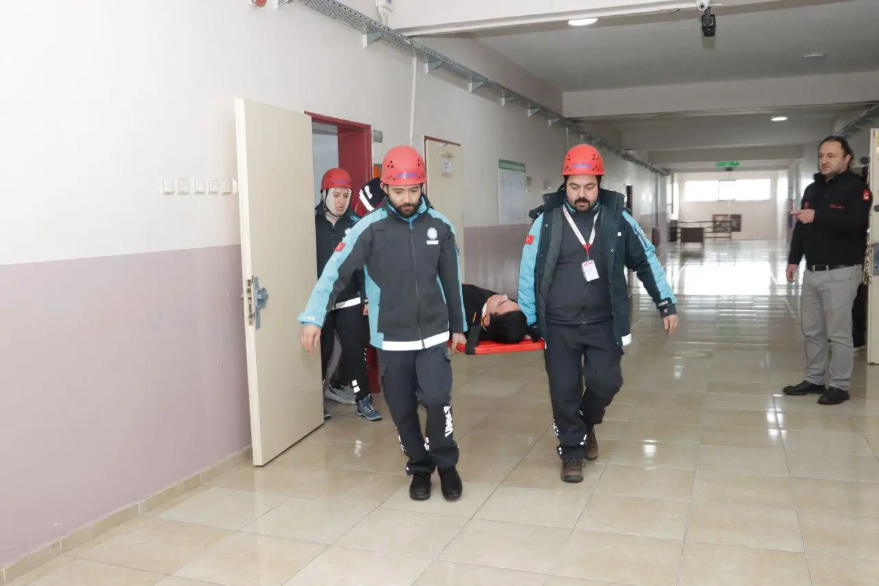 Düzenlenen tatbikatta senaryo gereği okulun üçüncü katında mahsur kalan bir yaralıya UMKE ekipleri yerinde ilk müdahale yaparak ambulansa ekiplerine teslim ediyor. Ve ardından aynı katta mahsur kalan bir öğrenciye itfaiye ekipleri kurtardı. Daha sonra burada itfaiye ekipleri tarafından yangın tatbikatı gerçekleştirdi.