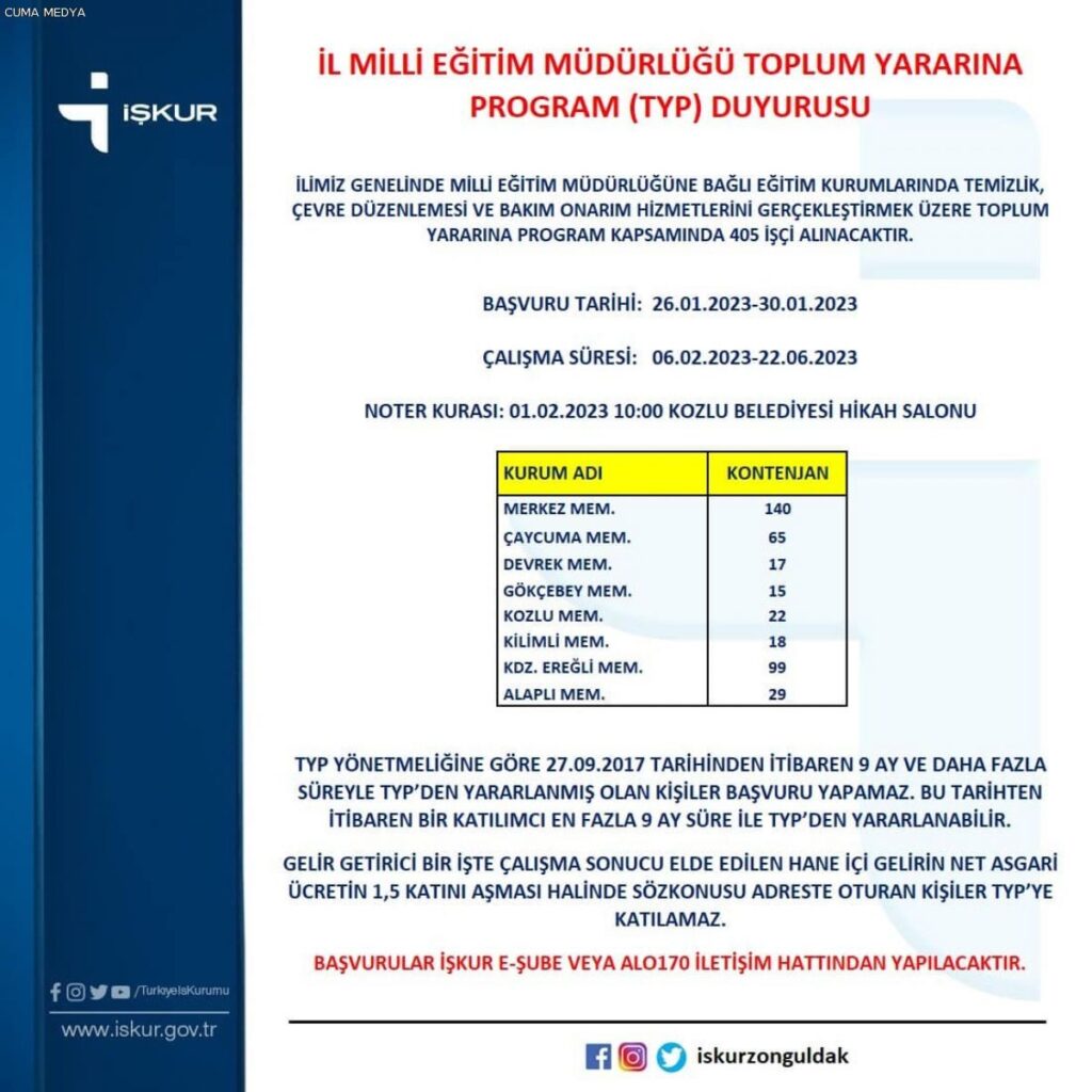 Zonguldak İl Milli Eğitim Müdürlüğü ve İşkur arasında Toplum Yararına Çalıştırma Programı (TYP) kapsamında, İl Milli Eğitim Müdürlüğüne bağlı eğitim kurumlarında temizlik, çevre düzenlemesi ve bakım onarım hizmetlerini gerçekleştirmek üzere 405 kişilik işçi alımı yapılacak.