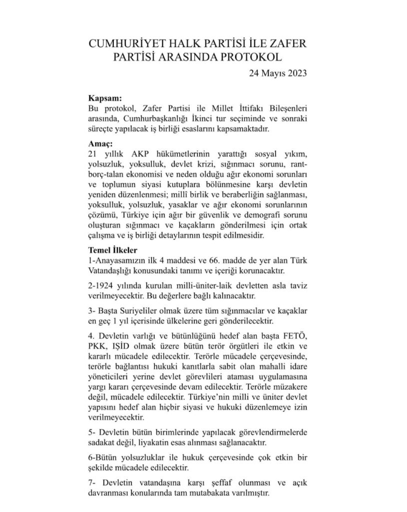 Zafer Partisi Genel Başkanı Ümit Özdağ, Cumhurbaşkanı adayı Kemal Kılıçdaroğlu ile üzerinde çalıştıkları mutabakat metninin ayrıntılarını paylaşmak üzere ortak basın toplantısı düzenledi. Zafer Partisi Genel Merkezi önünde yapılan açıklamada şu ifadelere yer verildi: