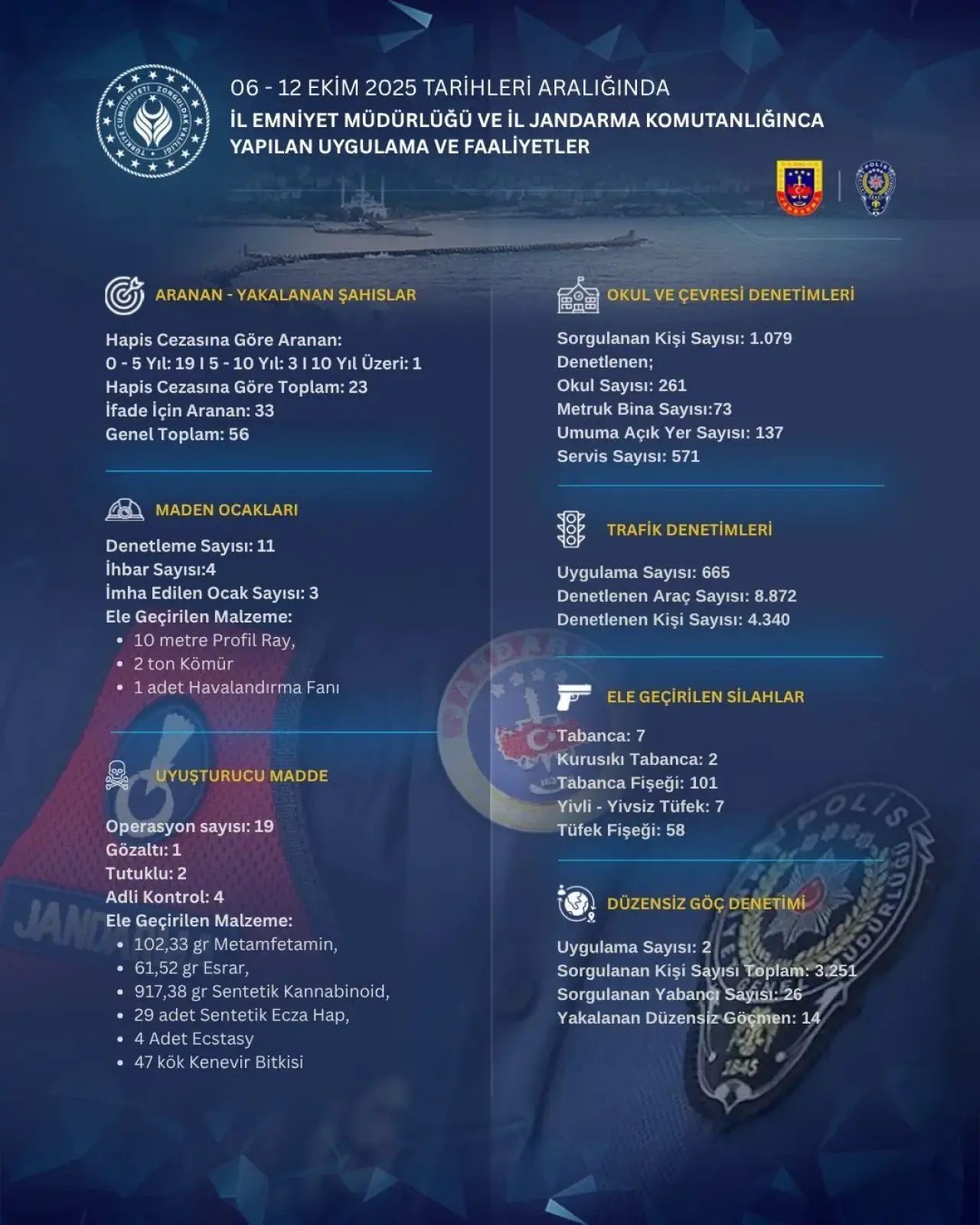 Bir hafta boyunca yapılan çalışmalar kapsamında çok sayıda suç unsuru ele geçirilirken, aranan şahıslar yakalandı, maden ocakları ve okullarda detaylı denetimler yapıldı.