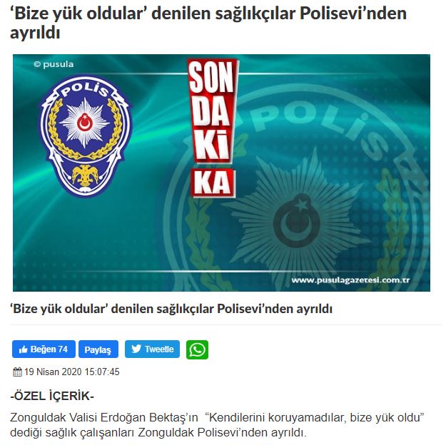 Pusula gazetesinde bugün yayımlanan ‘Bize yük oldular’ denilen sağlıkçılar Polisevi’nden ayrıldı başlıklı haberde sağlık çalışanlarının Polisevi’nden ayrıldığını belirten pusula gazetesi yalan haber yaparak algı operasyonu yapıyor.