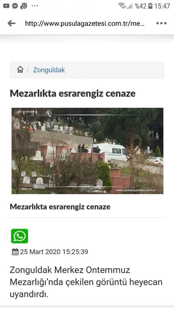 Zonguldak'ta mezarlıkta özel kıyafetli yetkililerin defnettiği cenazenin fotoğrafları, diğer gazeteciler halk arasında korku ve paniğe neden olur düşüncesiyle yayımlamazken Ali Rıza Tığ, 25 Mart tarihinde boy boy fotoğraf ve videosunu yayımlayarak korona virüsten öldüğünü ima etmişti.