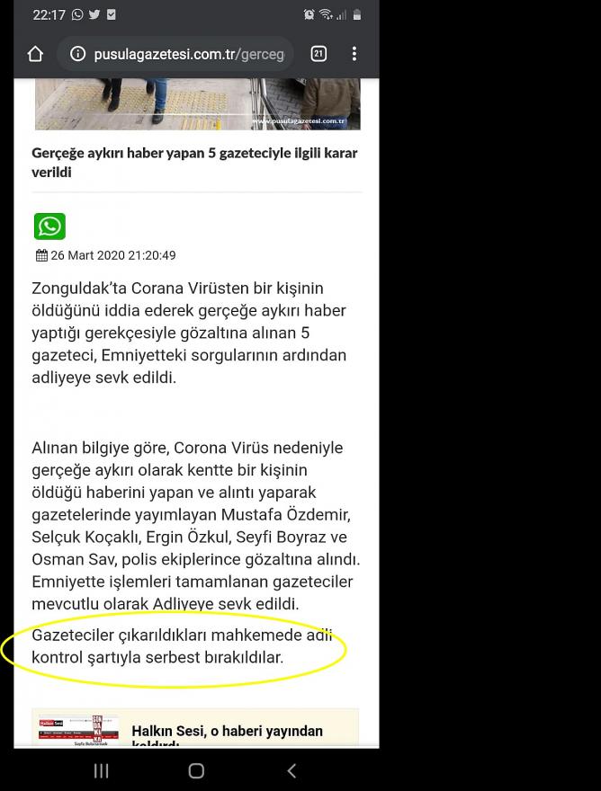 Nöbetçi savcının "Adli Kontrol istemiyle mevcutlu olarak" hakimin karşısına çıkan gazetecileri dinleyen hakim, gazetecilerin üzerine atılan "Halk Arasında Korku ve Panik Yaratmak amacıyla tehdit" suçu işlemediklerine kanaat getirip adli kontrol altına alınma yönündeki Cumhuriyet Başsavcılığının TALEBİNİN REDDİNE, bu kapsamda şüphelilerin SERBEST BIRAKILMASINA karar vermesine rağmen Pusula Gazetesi haberinde "Adli Kontrol şartıyla serbest kaldılar" yazarak nasıl bir niyet içerisende olduğunu bir kez daha gösterdi.