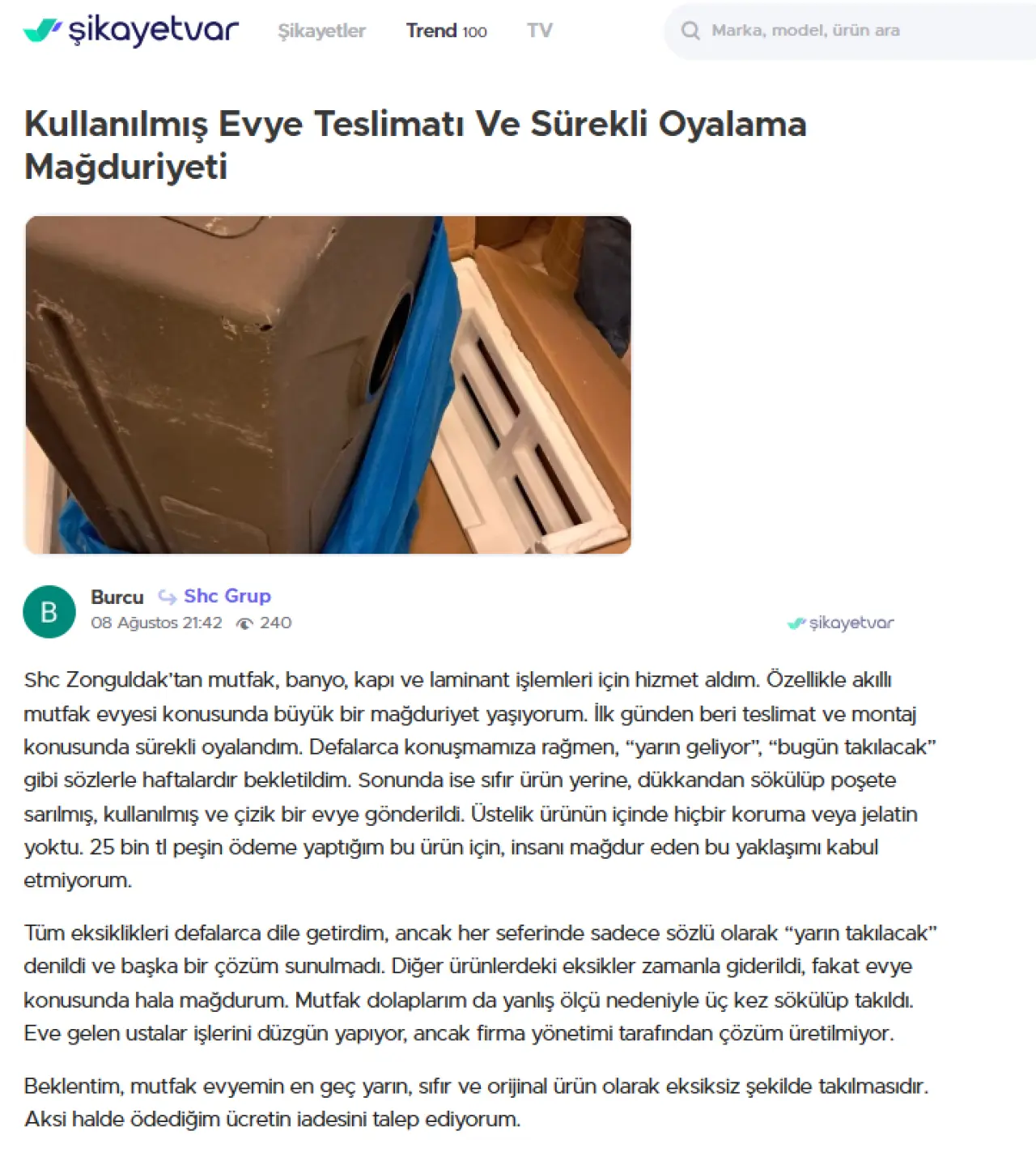 “Mutfak, banyo, kapı ve laminant işlemleri için anlaştım. Akıllı mutfak evyesi için 25 bin TL peşin ödedim ama sıfır ürün yerine kullanılmış, çizik bir evye gönderildi. Poşete sarılıydı, üzerinde jelatin bile yoktu. Defalarca aradım, her seferinde ‘yarın takılacak’ dediler ama haftalardır bekliyorum.”