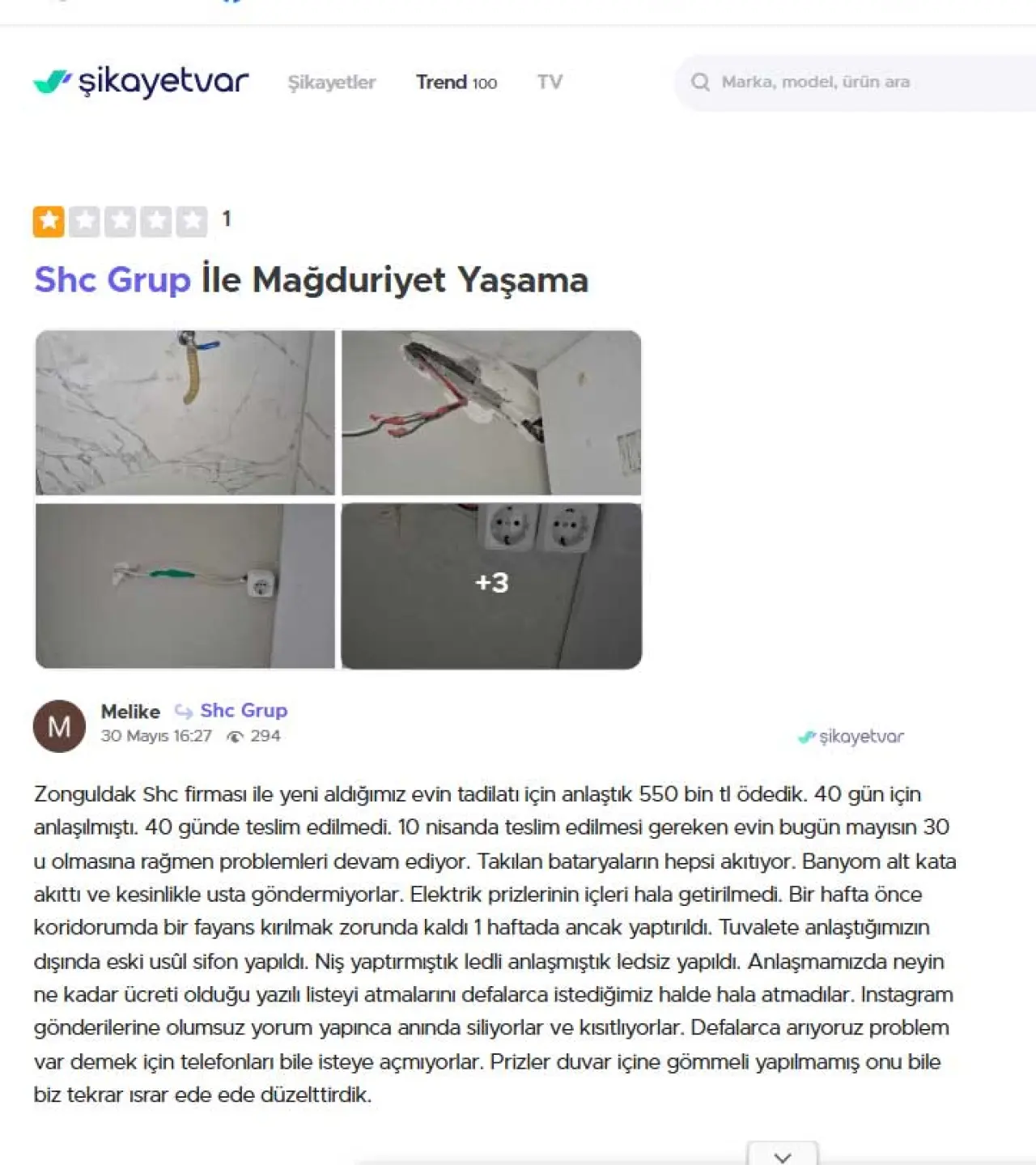 “Zonguldak SHC firması ile yeni aldığımız evin tadilatı için anlaştık, 550 bin TL ödedik. 40 gün içinde teslim edilecekti, ancak 50 günü geçtiği halde hâlâ bitmedi. Takılan bataryalar akıtıyor, banyom alt kata su sızdırdı, usta göndermiyorlar. Elektrik prizleri eksik, tuvalete anlaşmamız dışında eski sifon takıldı. Niş yaptırmıştık, ledsiz yapıldı. Instagram gönderilerine olumsuz yorum yapınca siliyorlar ve kısıtlıyorlar. Telefonları da açmıyorlar.”
