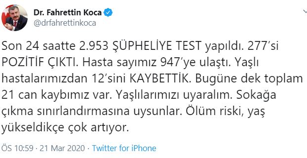 “Son 24 saatte 2.953 ŞÜPHELİYE TEST yapıldı. 277’si POZİTİF ÇIKTI. Hasta sayımız 947’ye ulaştı. Yaşlı hastalarımızdan 12’sini KAYBETTİK. Bugüne dek toplam 21 can kaybımız var. Yaşlılarımızı uyaralım. Sokağa çıkma sınırlandırmasına uysunlar. Ölüm riski, yaş yükseldikçe çok artıyor.” Dedi.