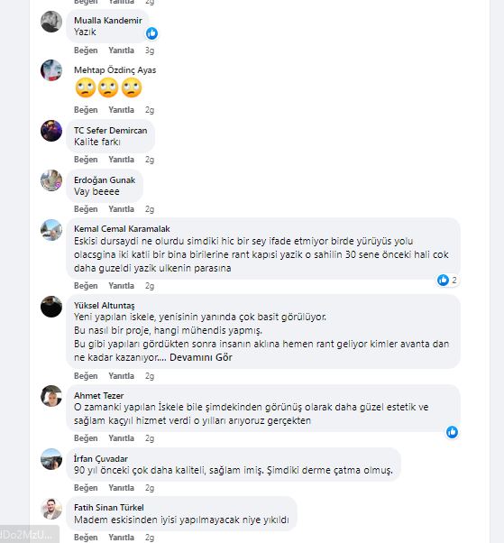 Başka bir yorum yapan Ahmet Tezer isimli vatandaş ise; “O zamanki yapılan İskele bile şimdikinden görünüş olarak daha güzel estetik ve sağlam kaç yıl hizmet verdi o yılları arıyoruz gerçekten” diyerek eski yıllara göre geri gidilmesine tepki gösterdi.