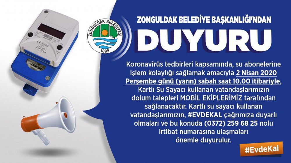 “Koronavirüs tedbirleri kapsamında, su abonelerine işlem kolaylığı sağlamak amacıyla 2 Nisan 2020 Perşembe günü (yarın) sabah saat 10.00 itibariyle, Kartlı Su Sayacı kullanan vatandaşlarımızın dolum talepleri MOBİL EKİPLERİMİZ tarafından sağlanacaktır. Kartlı su sayacı kullanan vatandaşlarımızın, #EVDEKAL çağrımıza duyarlı olmaları ve bu konuda (0372) 259 68 25 nolu irtibat numarasına ulaşmaları önemle duyurulur.”