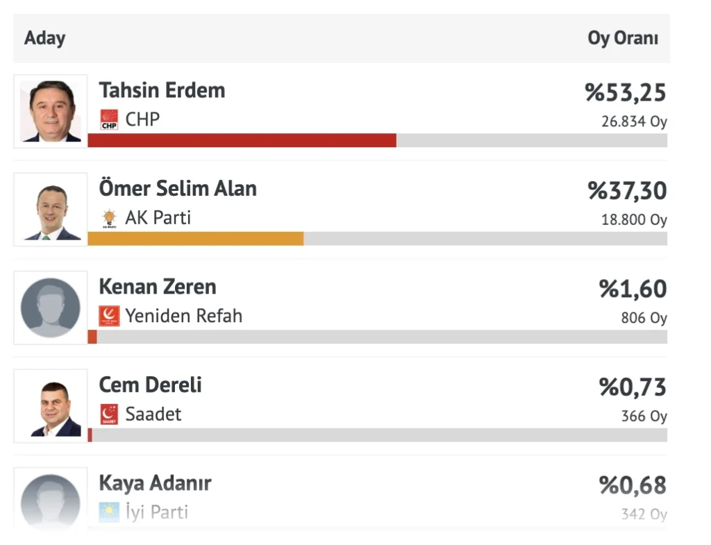 An itibariyle CHP Zonguldak Belediye Başkan Adayı Tahsin Erdem, Zonguldak Belediye Başkanı ve Cumhur İttifakı Belediye Başkanı Selim Alan’a 8 Bin 34 oy fark attı. İşte an itibariyle seçim sonuçları; CHP: (Tahsin Erdem) 26.834 (%53,25 AKP: (Selim Alan) 18.800 ( % 37,30) YRP: (Kenan Zeren) 806 ( % 1,60) SP: (Cem Dereli) 366 (% 0,73)