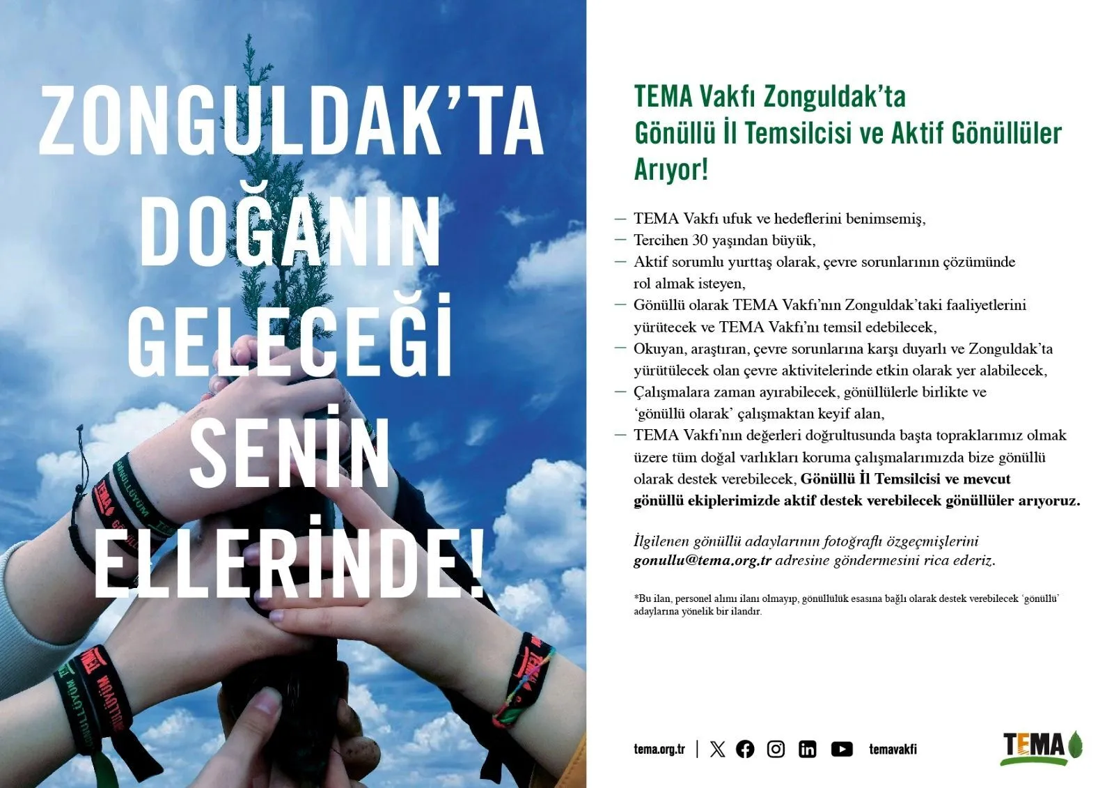 TEMA eski İl Temsilcisi Berran Aydan, yaptığı paylaşımında, “ Çok bilenler, oturduğu yerden konuşanlar ve klavye kahramanları… Haydi, emeğinizi, vaktinizi ve bilginizi TEMA'ya verin. Doğa için, yaşam alanlarımızı korumak için elinizi taşın altına sokun ve sorumluluk alın. Çalışın ve emek verin. Haydi.. Adayların [email protected] adresine fotoğraflı özgeçmişleri ile başvurmaları gerekiyor. Değerlendirmeyi TEMA Merkez yapmakta” ifadelerini kullandı. TEMA Vakfı Zonguldak'ta Gönüllü İl Temsilcisi için aranan şartlar ise şöyle: