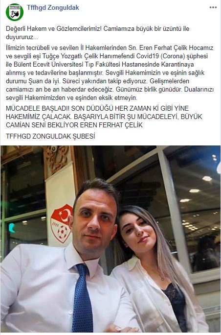 "Değerli Hakem ve Gözlemcilerimiz! Camiamıza büyük bir üzüntü ile duyururuz... İlimizin tecrübeli ve sevilen İl Hakemlerinden Sn. Eren Ferhat Çelik Hocamız ve sevgili eşi Tuğçe Yozgatlı Çelik Hanımefendi Covid19 (Corona) şüphesi ile Bülent Ecevit Üniversitesi Tıp Fakültesi Hastanesinde Karantinaya alınmış ve tedavilerine başlanmıştır. Sevgili Hakemimizin ve eşinin sağlık durumu Şuan da iyi. Süreci yakından takip ediyoruz. Gelişmelerden camiamızı an be an haberdar edeceğiz. Günümüz birlik günüdür. Dualarınızı sevgili Hakemimizden ve eşinden eksik etmeyin. MÜCADELE BAŞLADI! SON DÜDÜĞÜ HER ZAMAN Kİ GİBİ YİNE HAKEMİMİZ ÇALACAK. BAŞARIYLA BİTİR ŞU MÜCADELEYİ, BÜYÜK CAMİAN SENİ BEKLİYOR EREN FERHAT ÇELİK"