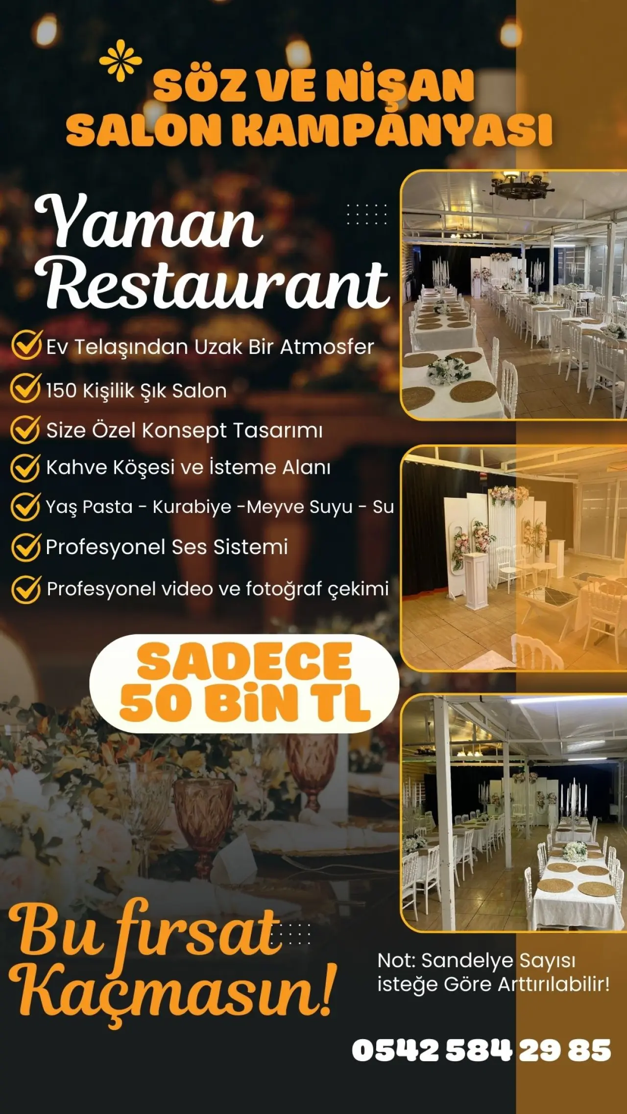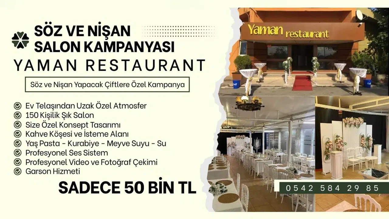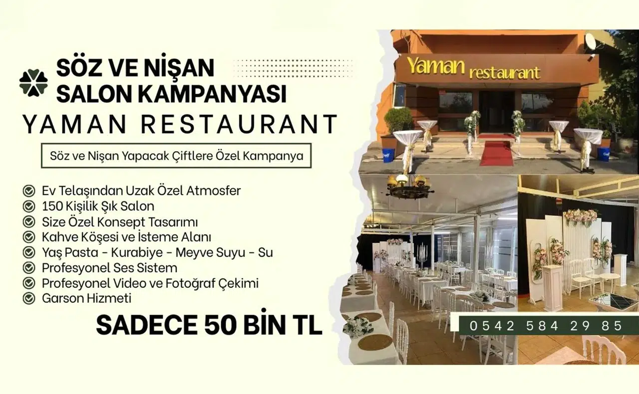 Zonguldak’ta hizmet veren Yaman Restaurant, söz ve nişan hazırlığı yapan çiftler için dikkat çeken bir kampanya başlattı. İşletme, özel günlerini şık ve konforlu bir ortamda geçirmek isteyenler için hazırladığı organizasyon paketini sadece 50 bin TL’den sunuyor.
