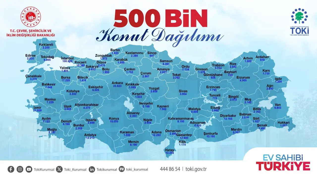 “Şehrimizde ve ilçelerimizde hayata geçirilecek konutların dağılımı belli oldu. Hangi ilçede kaç konut yapılacağı TOKİ tarafından kamuoyuna açıklandı. Vatandaşlarımız başvuru sürecine ilişkin tüm detaylara e-Devlet üzerinden ulaşabilir.”