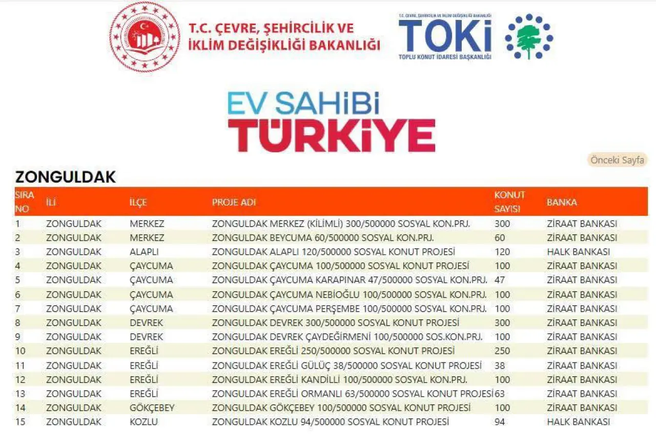 Açıklanan listeye göre konutlar; Merkez, Devrek, Çaycuma, Gökçebey, Alaplı, Ereğli ve Kozlu’da farklı proje adlarıyla uygulanacak. İl genelinde projeler 38 ile 300 konut arasında değişen sayıdaki etaplarla yürütülecek. Başvuru işlemleri Ziraat Bankası ve Halkbank aracılığıyla yapılacak.