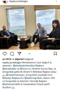 NAZTEKNİK OSGB şirketinde Portföy Yöneticisi Ceyda Türedioğlu sosyal medya hesabından yapmış olduğu paylaşım şaşkınlık yarattı. ELCAB Kablo ve HOÇİN Yönetim Kurulu Başkanı Necdet Tıskaoğlu ve Çaydeğirmeni Belediye Başkan Adayı Satılmış Gebeş ile bir ziyarette bir araya gelen Türedioğlu bu buluşmanın fotoğrafını sosyal medya hesabından yayınlarken, Tıskaoğlu’ndan “Memleketimin çok değerli iş adamları ELCAB Kablo Hentbol Başkanı, ELCAB Kablo ve HOCİN Yönetim Kurulu Başkanı ve Zonguldak gelecek Dönem İl Belediye Başkan Adayı diye bahsetmesi şaşkınlık yarattı. Türedioğlu Nejdet Tıskaoğlu ve Satılmış Gebeş ile paylaştığı fotoğrafın altına yazdığı yazıda; “Memleketimin çok değerli iş adamları ELCAB Kablo Hentbol Başkanı, ELCAB Kablo ve HOCİN Yönetim Kurulu Başkanı ve Zonguldak gelecek Dönem İl Belediye Başkan Adayı Nejdet Tıskaoğlu, Çaydeğirmeni Belediye Başkanı Satılmış Gebeş, Askon USA ve Zonguldak İş Adamları Derneği Başkanı Ayhan Özmekik ile tanışmaktan büyük şeref duydum” notunu ekledi.