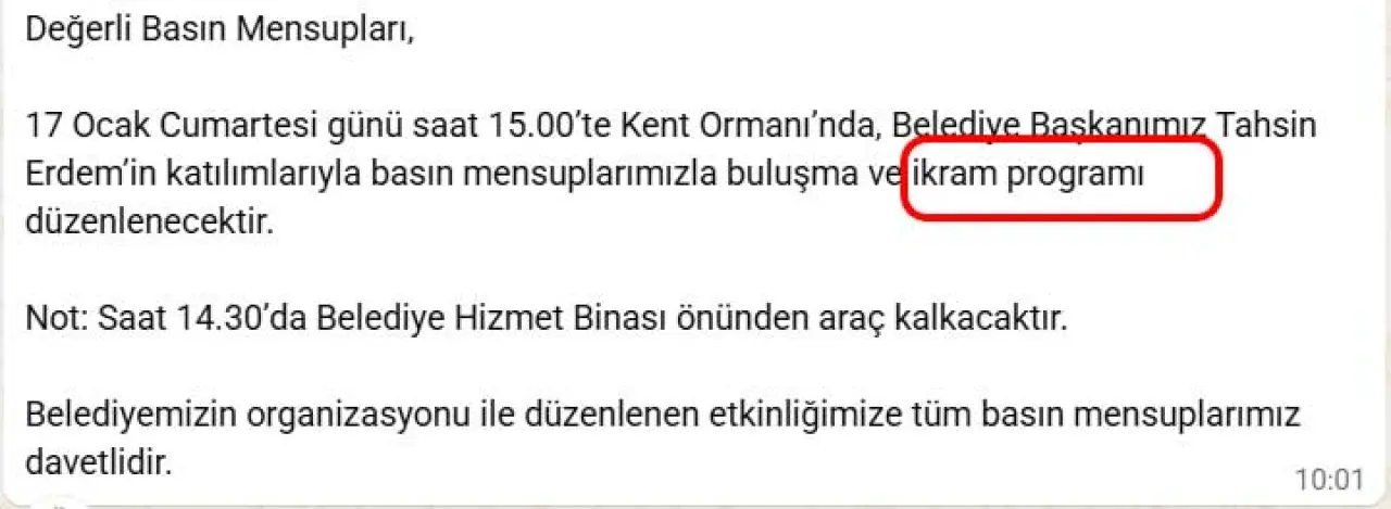 Gazeteciler, bir belediyenin ya da kamu kurumunun davetine katılırken bunun bir basın toplantısı, bilgilendirme toplantısı ya da saha gezisi kapsamında yapılmasını doğal karşılıyor. Ancak davetin içeriğinde özellikle “ikram” vurgusu yapılması, “basını davet ederken menü yazmaya gerek var mı?” sorusunu da beraberinde getirdi.