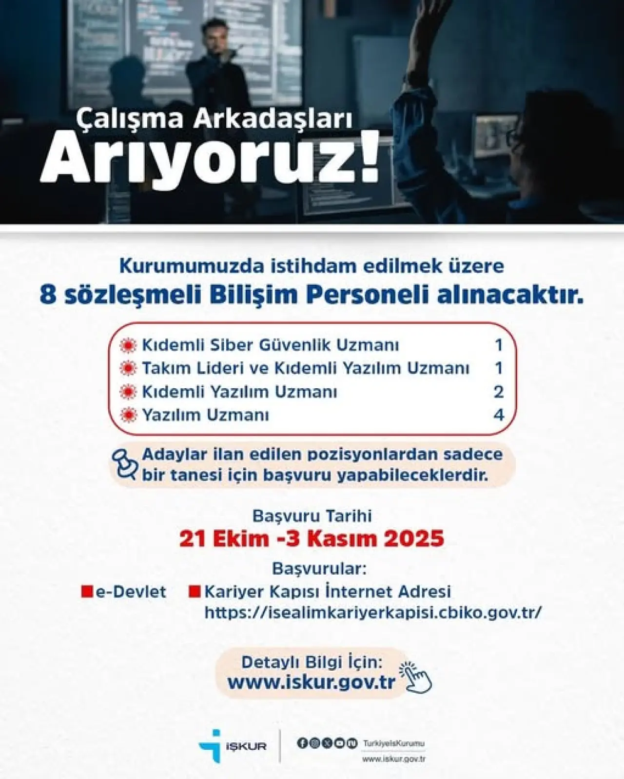 İlan kapsamında kıdemli siber güvenlik uzmanı, yazılım uzmanı ve takım lideri gibi bilişim alanında uzmanlık gerektiren kadrolar için personel alımı gerçekleştirilecek. Başvuruda bulunmak isteyen adayların gerekli şartları ve detaylı bilgileri İŞKUR’un resmi internet sitesi olan www.iskur.gov.tr adresinden öğrenebileceği belirtildi.