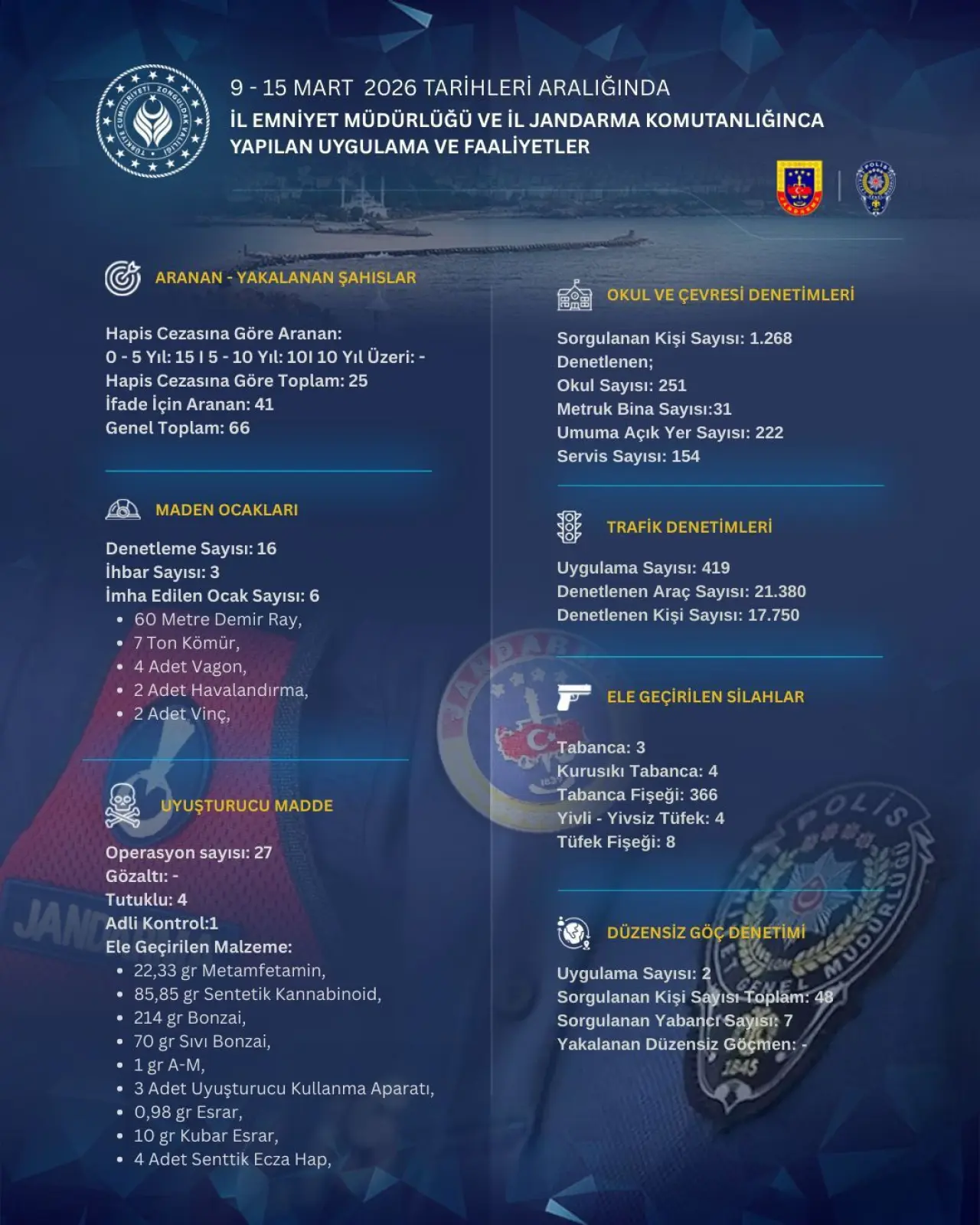 Yetkililer, Zonguldak genelinde vatandaşların huzur ve güvenliğini sağlamak amacıyla denetim ve operasyonların kararlılıkla sürdürüleceğini vurguladı. Özellikle kaçak maden ocakları, uyuşturucu ticareti ve trafik güvenliği konularında denetimlerin artarak devam edeceği ifade edildi.