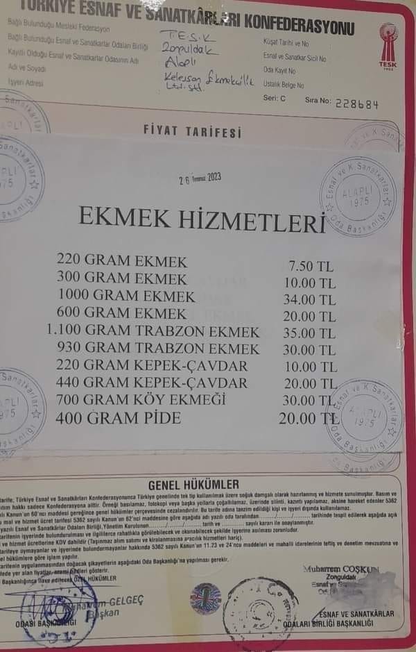 Alınan karara göre; Alaplı’da 220 gram ekmek 7.50 liradan, 300 gram ekmek 10, 600 gram ekmek 20, 1000 gram ekmek 34, 930 gram Trabzon ekmeği 30, 1100 gram Trabzon ekmeği 35, 220 gram kepek-çavdar ekmeği 10, 440 gram kepek-çavdar ekmeği 20, 700 gram köy ekmeği 30, 400 gram pide ise 20 liradan satışa sunulacak.