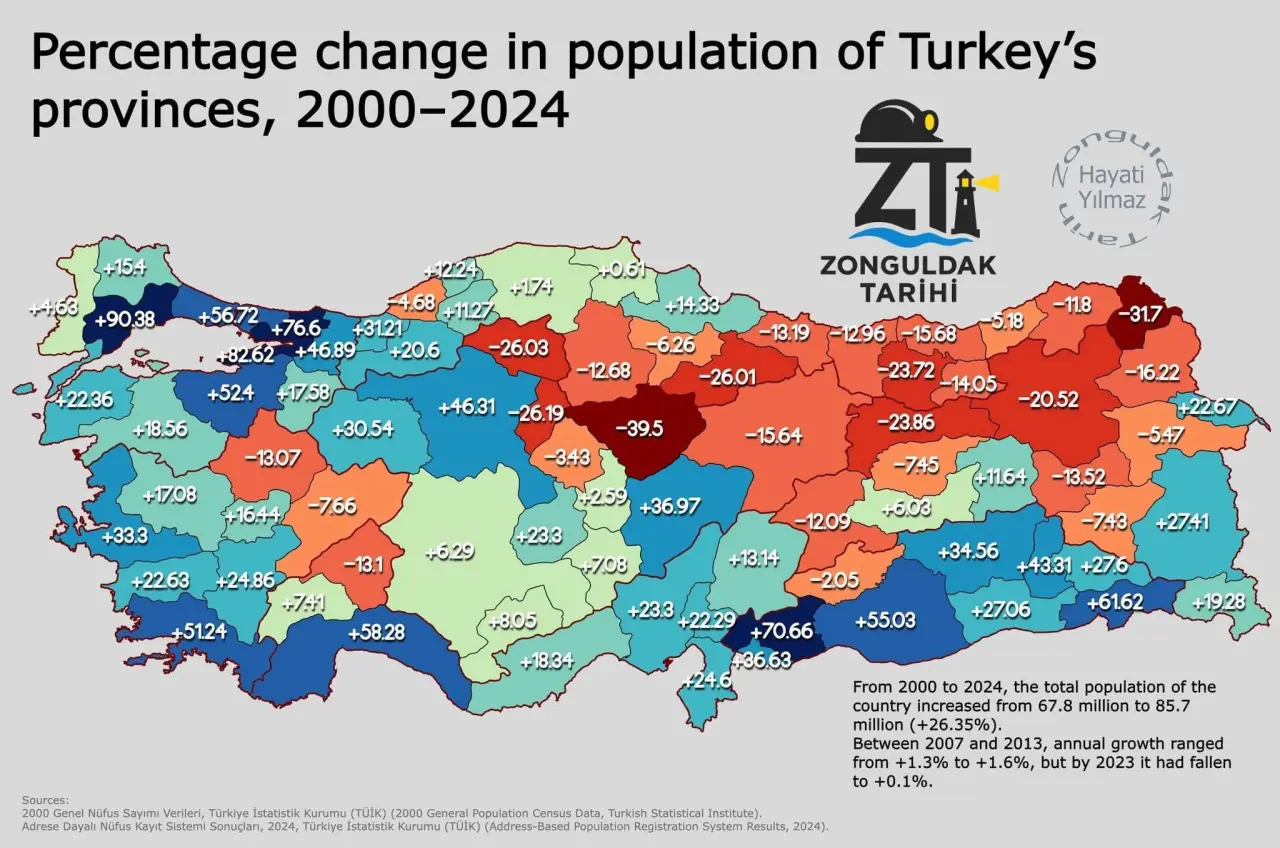 Zonguldak’ın son 24 yıldaki nüfus değişimini değerlendiren Zonguldak Tarih sayfası editörü Hayati Yılmaz, Türkiye genelindeki nüfus artış–azalış oranlarını gösteren uluslararası bir istatistik haritası üzerinden dikkat çekici bir analiz paylaştı.