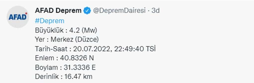 Afet ve Acil Durum Yönetimi Başkanlığı Deprem Dairesi Başkanlığı (AFAD) verilerine göre, saat 22.49'da Düzce’de yerin 16 kilometre derinliğinde 4.2 büyüklüğünde bir deprem meydana geldi.