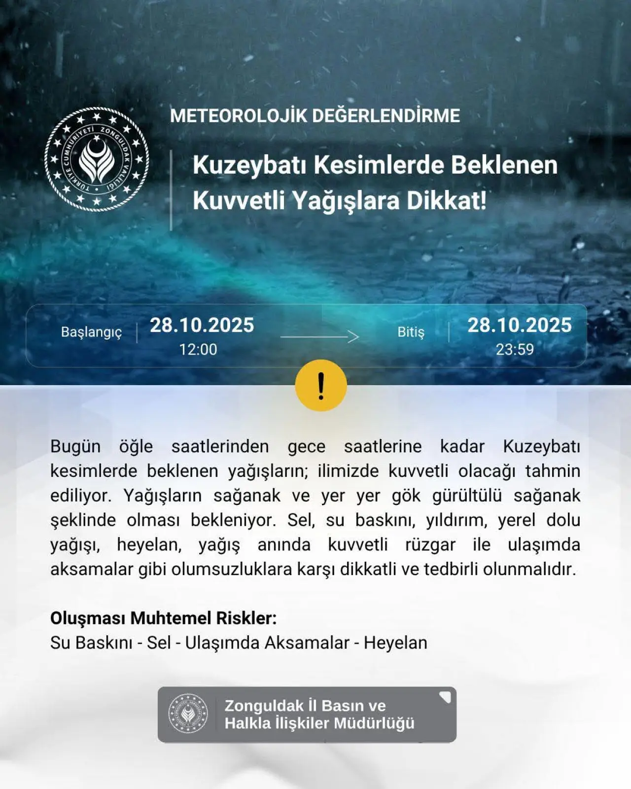 Meteorolojiden yapılan son değerlendirmeye göre, bugün (28 Ekim 2025) öğle saatlerinden itibaren kuzeybatı kesimlerde etkili olması beklenen yağışlar Zonguldak genelinde kuvvetli şekilde hissedilecek.